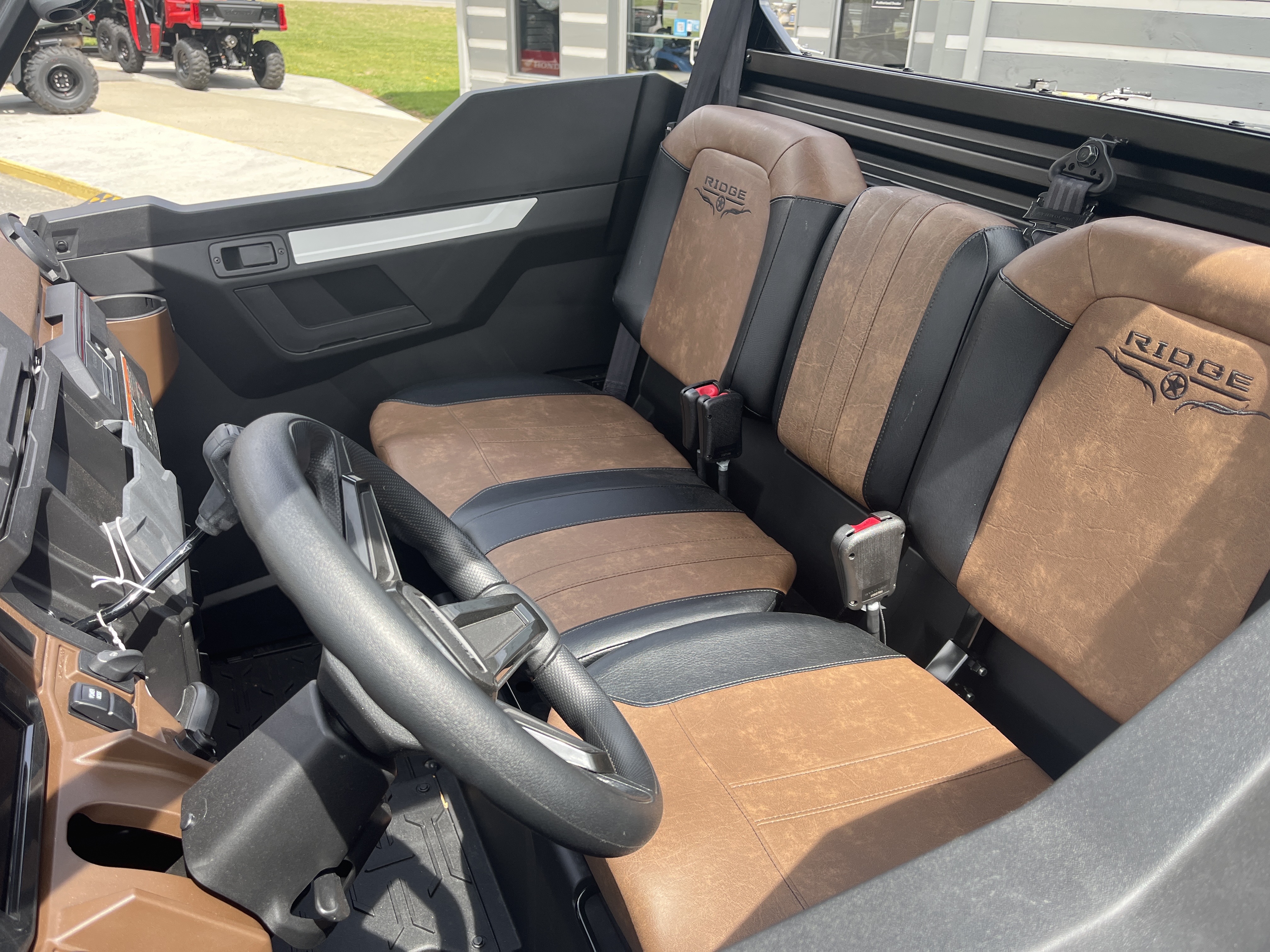 The RIDGE® side x side's ride comfort starts inside the cabin, with ample shoulder space and legroom for three people seated side by side, as well as three-point seatbelts for support. Lever-adjustable driver's seat and tilt steering allow the driver to further fine-tune their position for increased control and comfort. Sliding behind the wheel feels like getting into a car–from the natural sitting position to the position of the steering wheel and controls.
